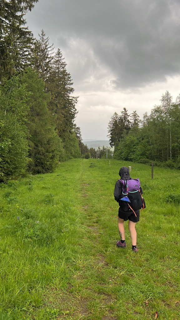 Vlakem jsme z Plesné dojeli s manželem do Rehau a pokračovali směr západní bod. Cestou jsem se pokoušela kamarádit s mým fialovým monstrem (já vím, přeháním), postupně se dařilo.V Aši jsem si ve večerce chtěla koupit jablíčko a oni tam měli jen jedno tak akorát na kompost?! Takže jsem přemohla svůj strach z dětských kapsiček a dala si tu. Viděli jste ty fotky co v tom lidi nacházejí za hnusy? Na rozhledně Háj za Aší nás chytl déšť s bouřkou tak jsme se chvíli schovávali a poté nasadili nepromok a pokračovali dále, dolů po sjezdovce a blátem skrz les.Někde před Halštrovem jsem chtěla nabrat vodu a zjistila, že nemám filtr (druhý den se našel v autě). Zachránili nás v Café Fichtl.Okolo 6 jsme dorazili k útulně za Vernéřovem a zakempili tam. Teď pro změnu manžel zjistil, že nemá zapalovač. Před studenou večeří nás zachránili kolemjdoucí stezkaři. Díky!Poslední fotka dvou mimoňů je ze Štítar.První den byl rozcvičkový a od dalšího dne už sama. Moc nefotím, spíše se kochám takže fotodokumentace nic moc:)