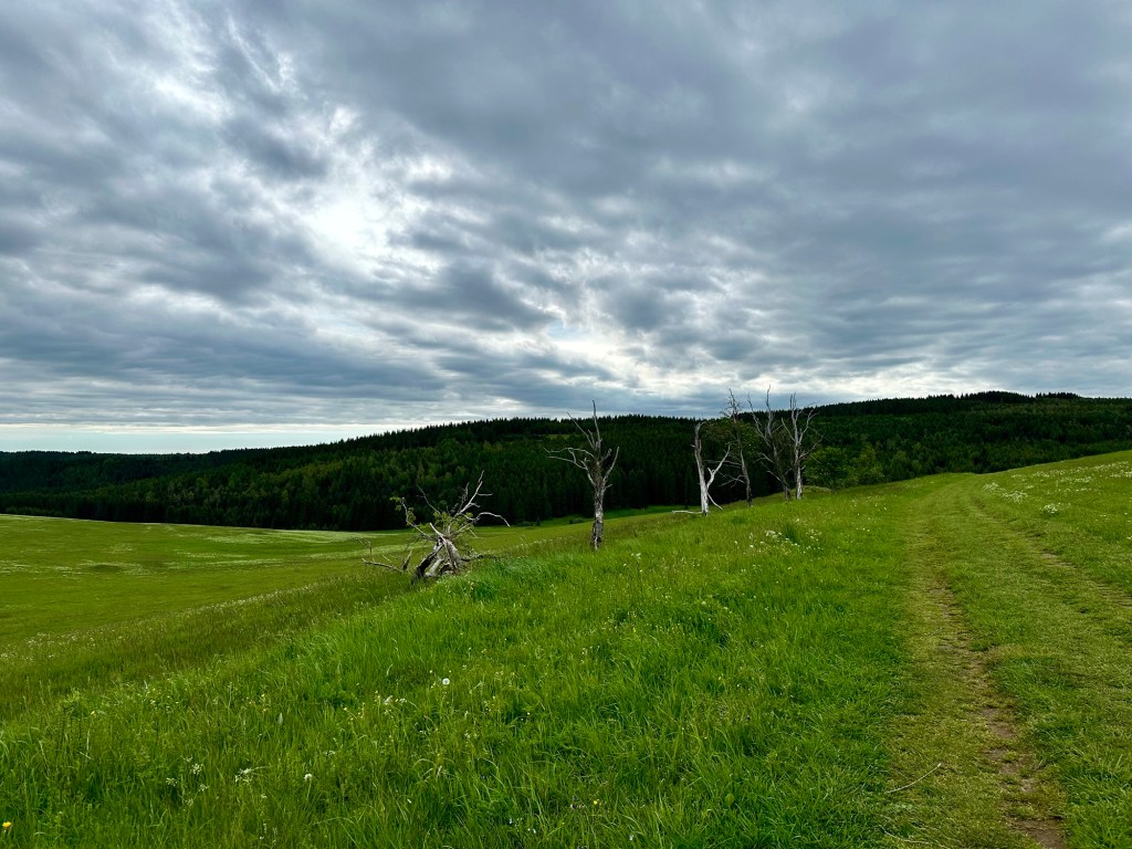 Tenhle úsek jsem si opravdu neužila a bála se kdy mě někdo srazí. Od rozcestí Výsluňská cesta však nastává asfaltové peklo, bez hůlek bych to tu neprošla, bolí mě ťapky a jdu to jen hlavou. Nakonci lesa mě čeká lehké stoupání (naštěstí bez asfaltu), a smluvené setkání s manželem.. Nadšeně ho vyhlížím, přivítáme se společně dojdeme k autu v Hoře Svatého Šebestiána. Jedu na čtyři dny domů, ale o tom možná později.