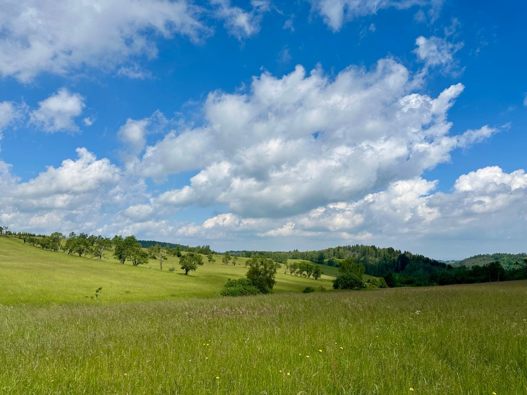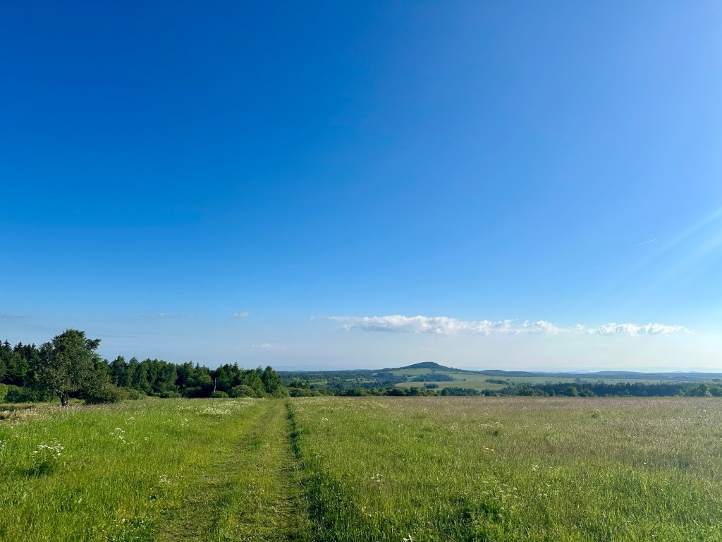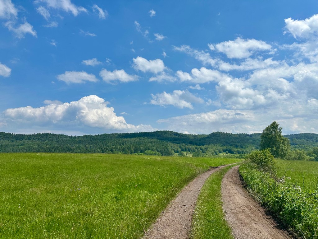 Na pokoji jsem si naschvál nezatáhla závěsy abych se probudila se sluníčkem. Povedlo se, ale z postele se vyhrabu až po šesté, před půl osmou už šlapu. Hned za vesnicí mě čeká travnatý úsek takže si tradičně zmáčím boty.