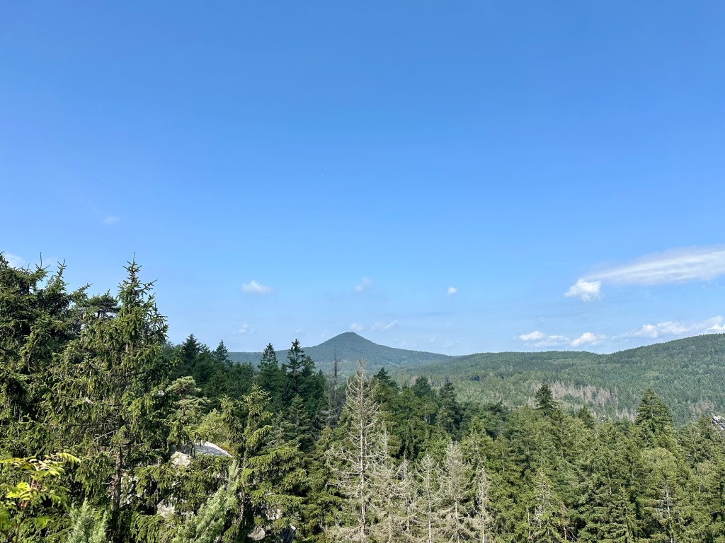 Projdu kousek německé silnice a na výhled Jánské kameny. Při výhledu na Hvozd přemýšlím zda ho nevynechat, ale nedá mi to. Jde se tedy na horu. Při finálním výstupu si připadám jako horolezec a opravdu jsem ráda, že to jdu za sucha. Leze se tam docela kolmo a po velkých kamenech.