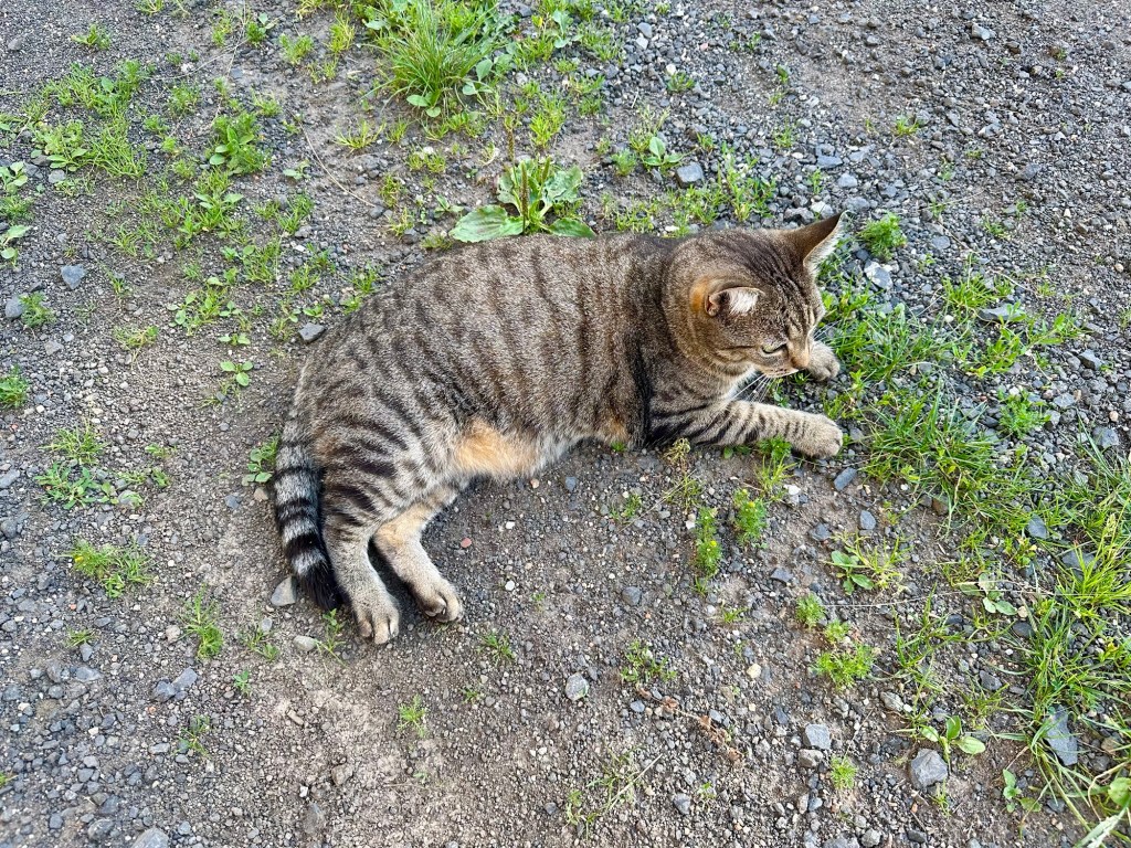 Po chvíli potkám číču, která vypadá jako jedna z našich venkovních. Je ukecaná a mazlivá, chvíli si u ní sednu do trávi. Skoro bych řekla, že bude každou chvíli rodit. Snad ji tu chudáka nikdo nevyhodil aby se nemusel starat o koťata.