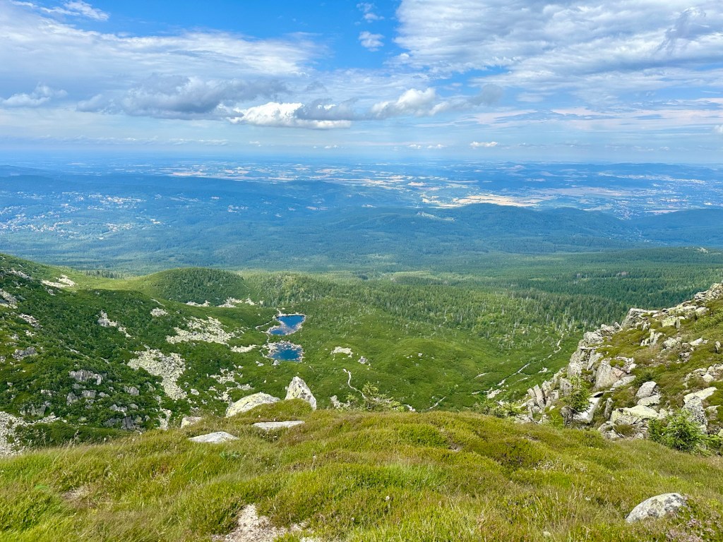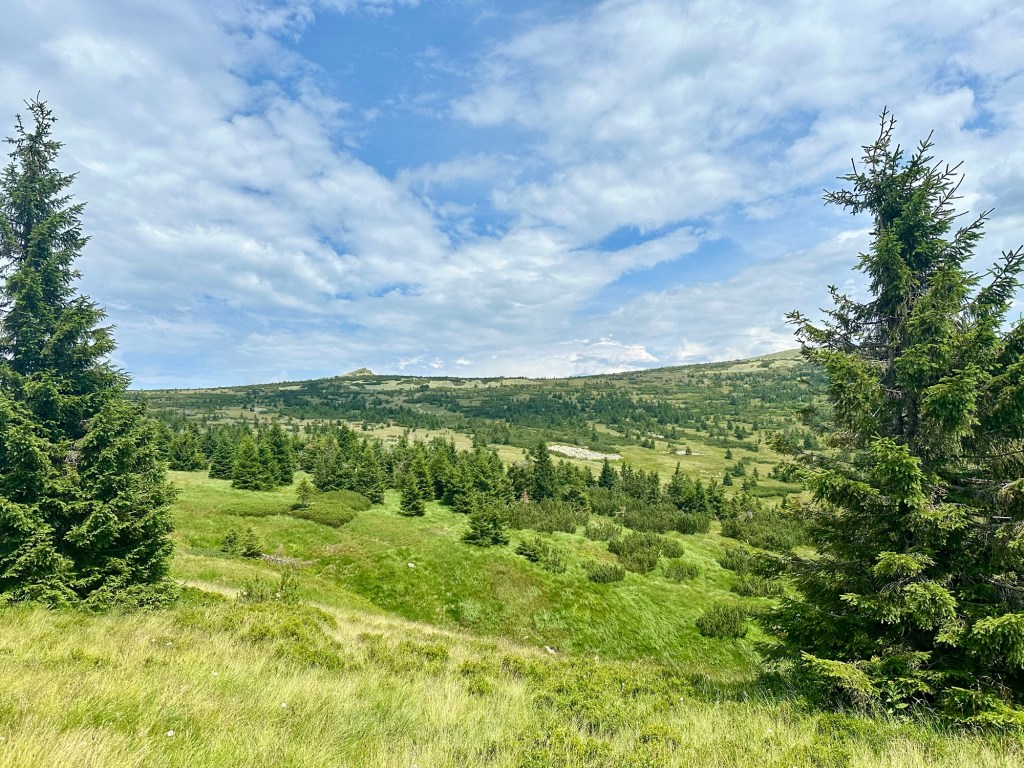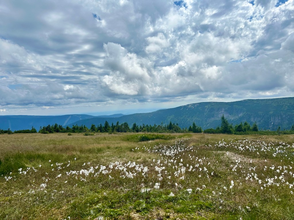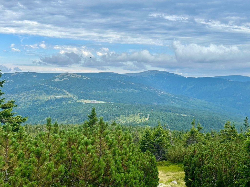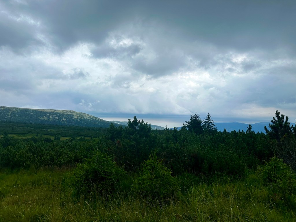 Ani nevím jak a jsem u Krakonošovi snídaně. Kousek od rozcestí mě dožene pán (teď mi dochází, že ani nevím jméno) má za sebou celou Stezku tak máme společné téma. Když poprvé vylezu z lesa a jsou vidět ty výhledy skoro se rozpláču. Na rozcestí U Čtyř pánů to samé. Už teď vím, že do Krkonoš se určitě vrátím.