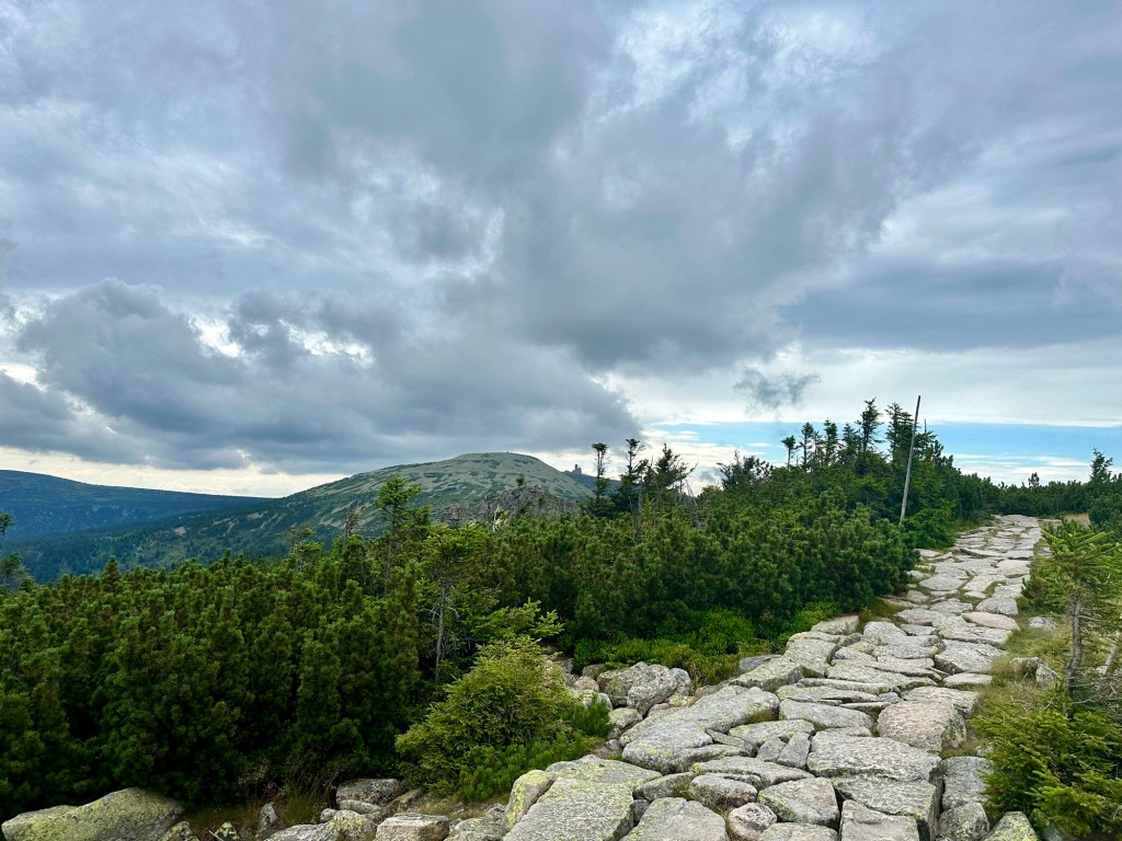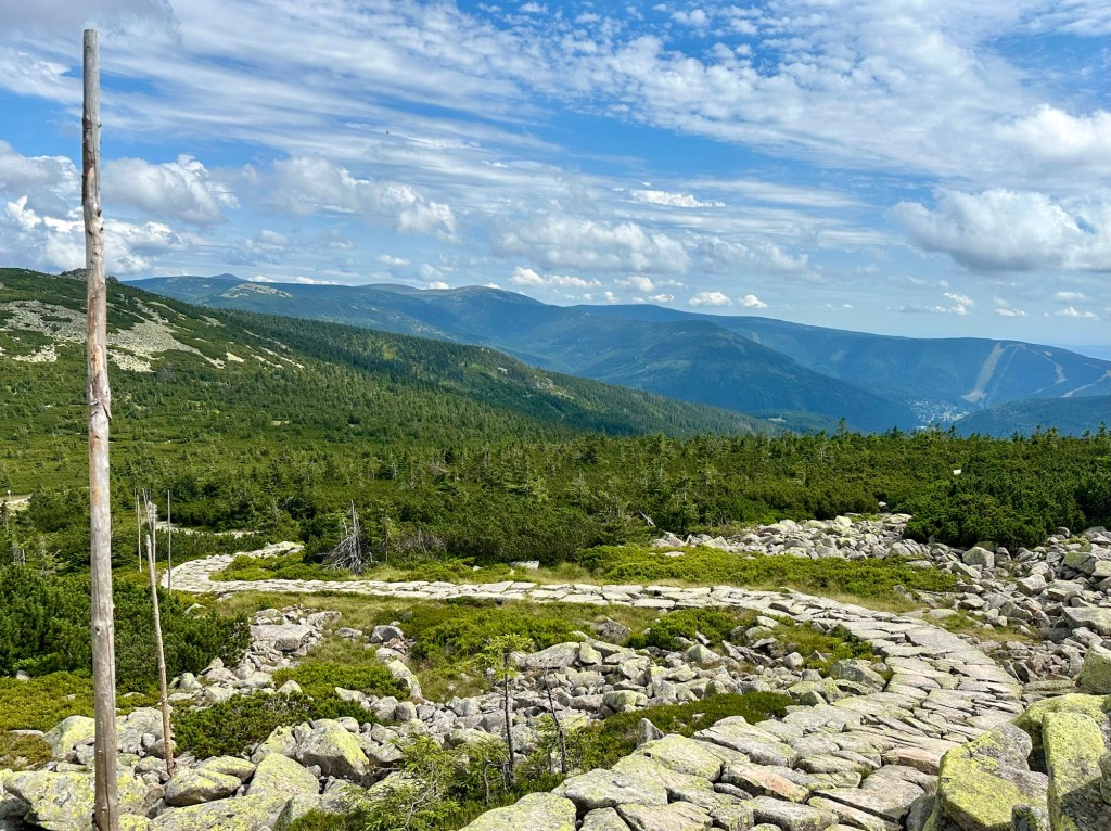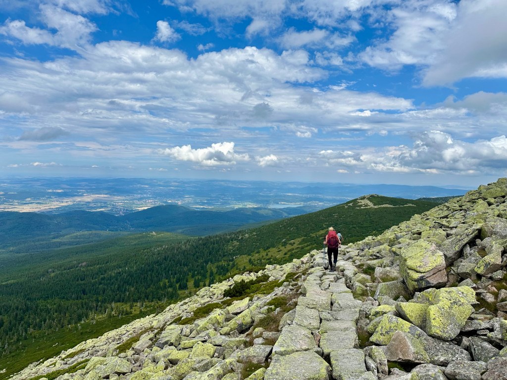 Na rozcestí U Labské boudy se dám po žluté směr Sněžné jámy. Budu se opakovat, ale je to tu boží. Nahoře obhlédnu všechny výhledy a jde se na rozcvičku pro mé vyviklané kotníky. Tyhle kamenné cesty jim úplně nesvědčí.