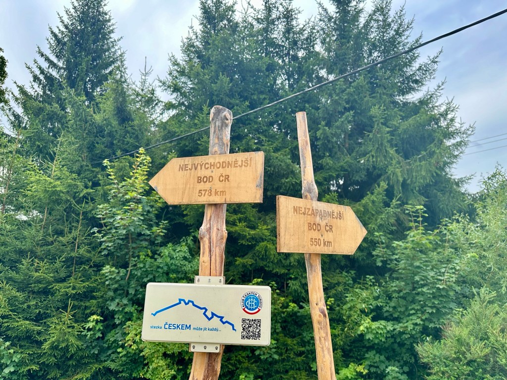 Na rozcestí u milníku stezky me dožene další skoro stezkař (jde si na dva dny podle sebe), pokračujeme spolu.