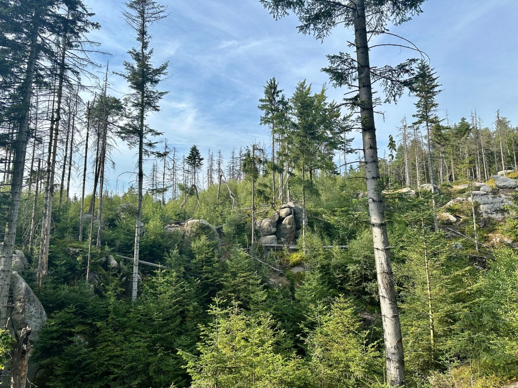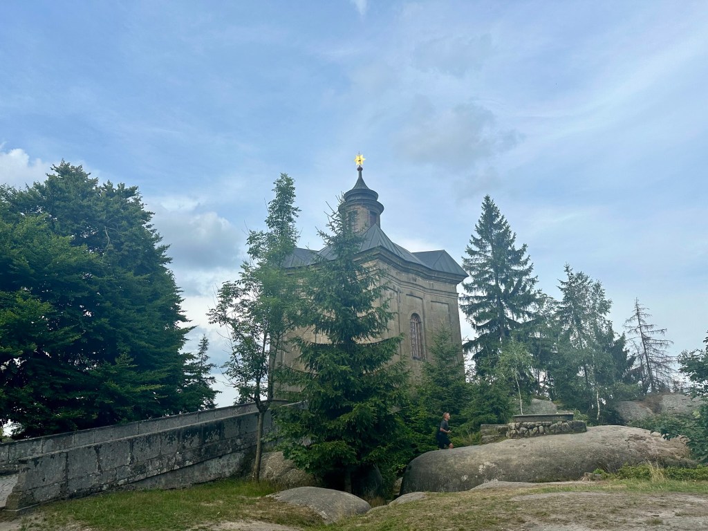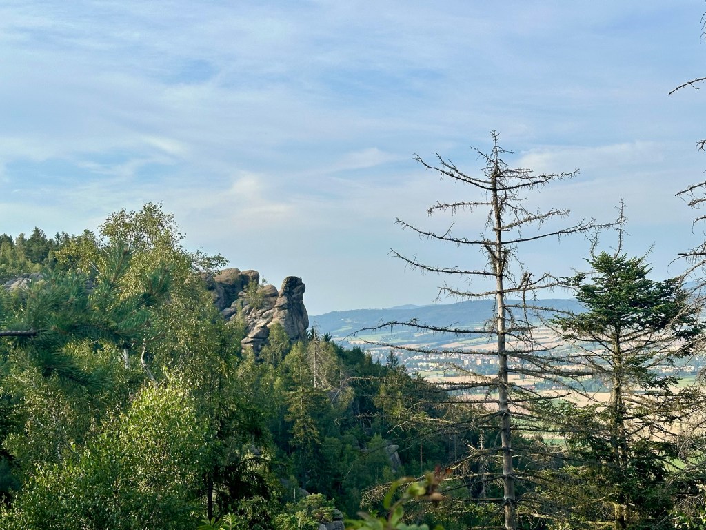 Konečně zajdu do lesa. U první lavičky před Vernéřovicema si dám oběd. Cestou skrz se zdržím u místní číči.