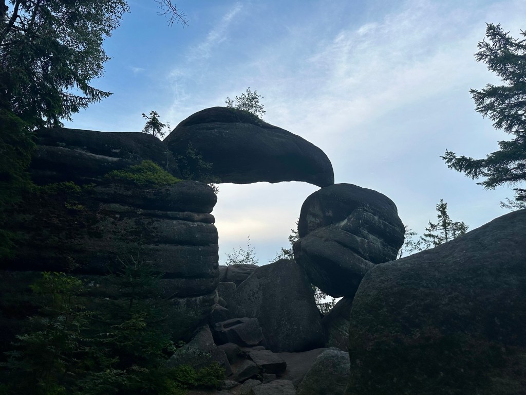 Dáme rychlou pauzu u Kamenné brány, tu jsem si přejmenovala na ptáčí lebku. Mineme vyhlídku Koruna a po zelené se konečně okolo deváté dostaneme k přístřešku. Někdo tu už spí v hamace, postavím si tedy stan, kolega spí pod širákem. Na to já zatím sbírám odvahu.