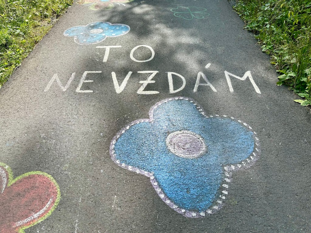 Do Spálova si vyšlápneme pár výškových metrů po asfaltu. Je tu po silnici spoustu malůvek a psaní, díky čemuž se jde mnohem lépe.