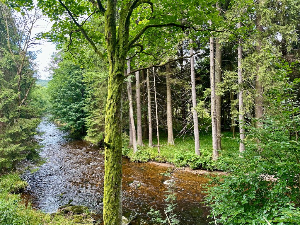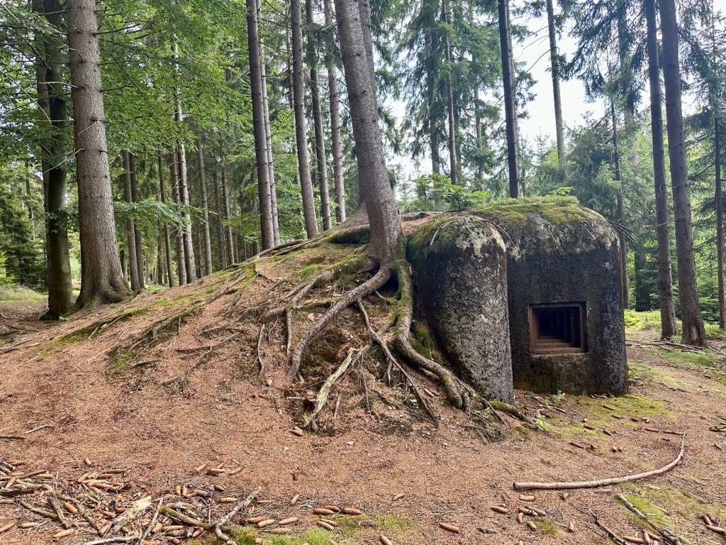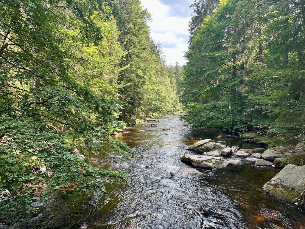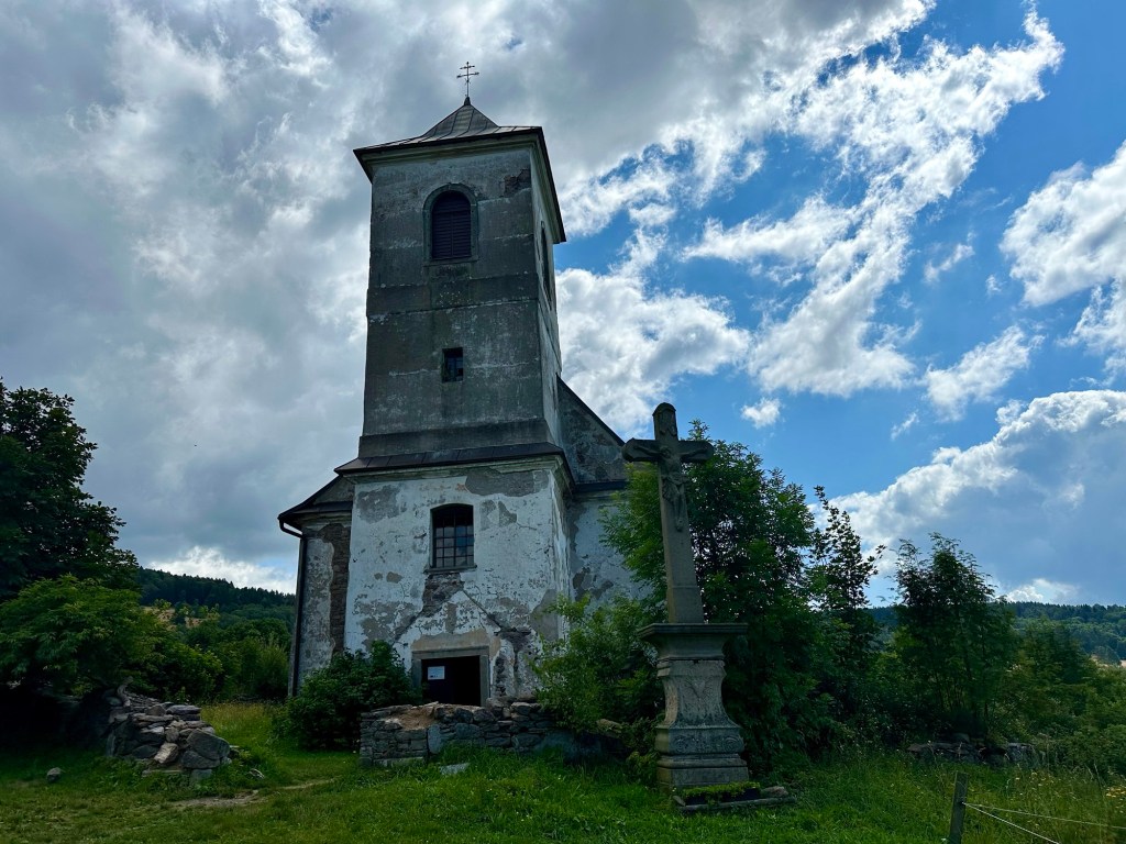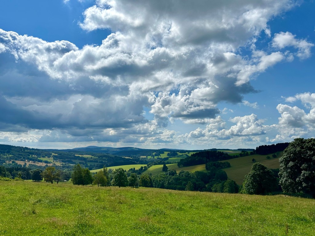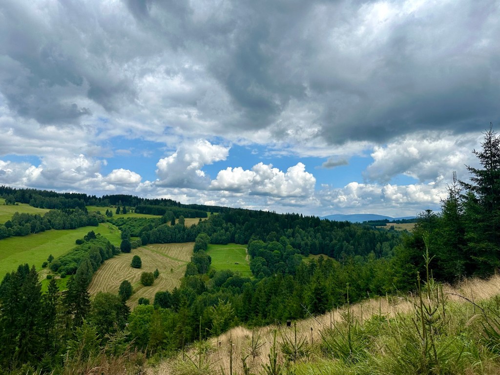 Dnes se mnou vyráží i taťka. Plán byl vyjet v osm, ale než se sbalil je skoro 9 a na stezce jsme až před desátou. Z Neratova si vylezeme na vyhlídku Vysoký Kořen. Po žluté až do Bartošovic, kde si dáme oběd i kafíčko. Taťka vypadá, že si to užívá. Já také, jen bych šla občas trochu rychleji.