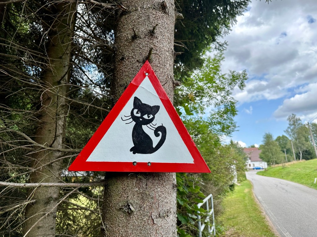 Přes Pašeráckou lávku k Zemské bráně a po silnici na Čihák. Tady mě pobaví cedule pozor kočky a nadšeně zdravím první, co uvidím. Absťak po zvířatkách je znát(: