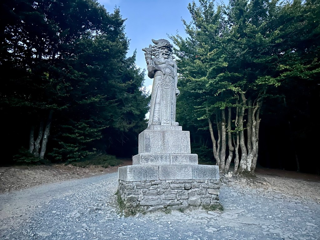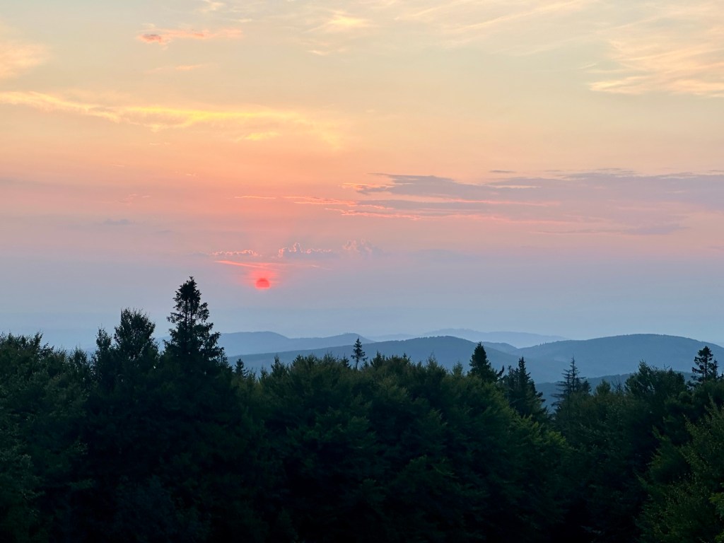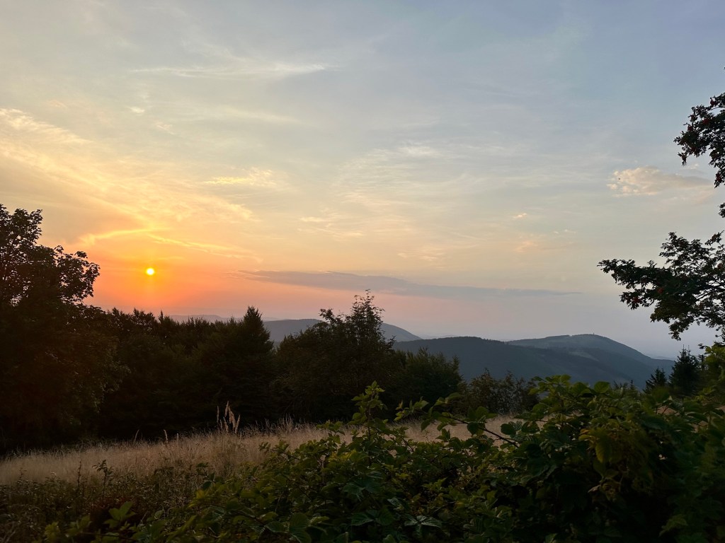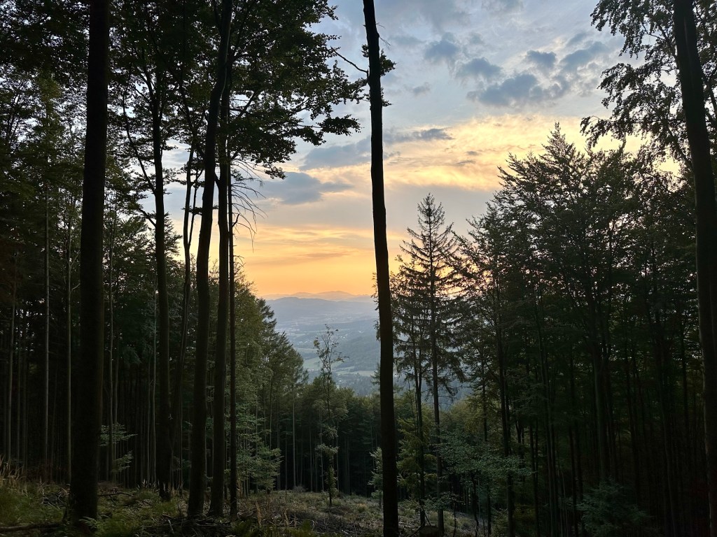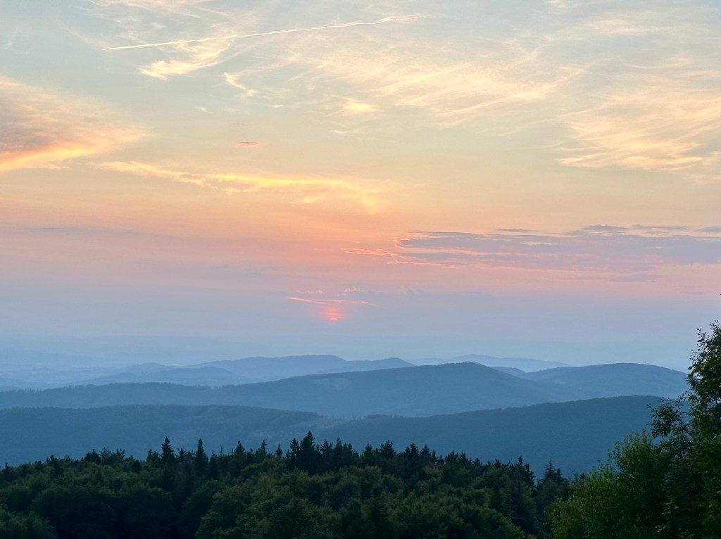 Při výstupu na Radhošt opět postrádám hůlky. Ale alespoň se při pauzičkách kochám západem slunce co mám za zády.
