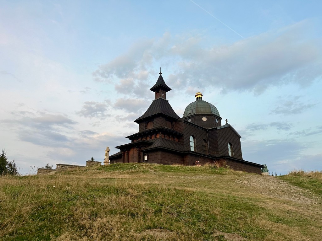 Je skoro osm a už není moc vidět. Na Pustevny docházíme za tmy. Alespoň jsem si vyzkoušela chůzi s čelovkou.