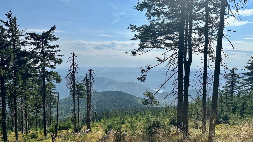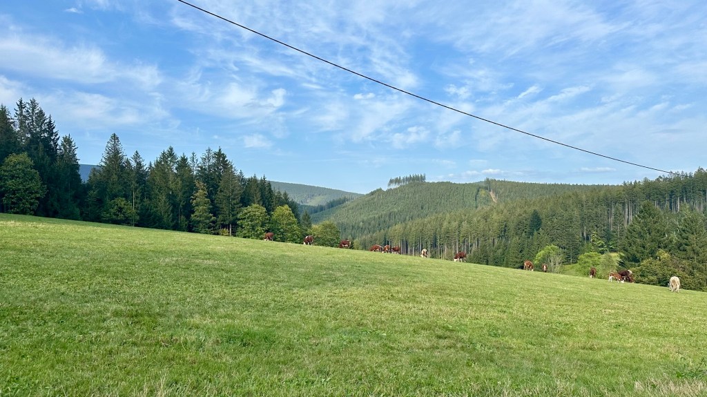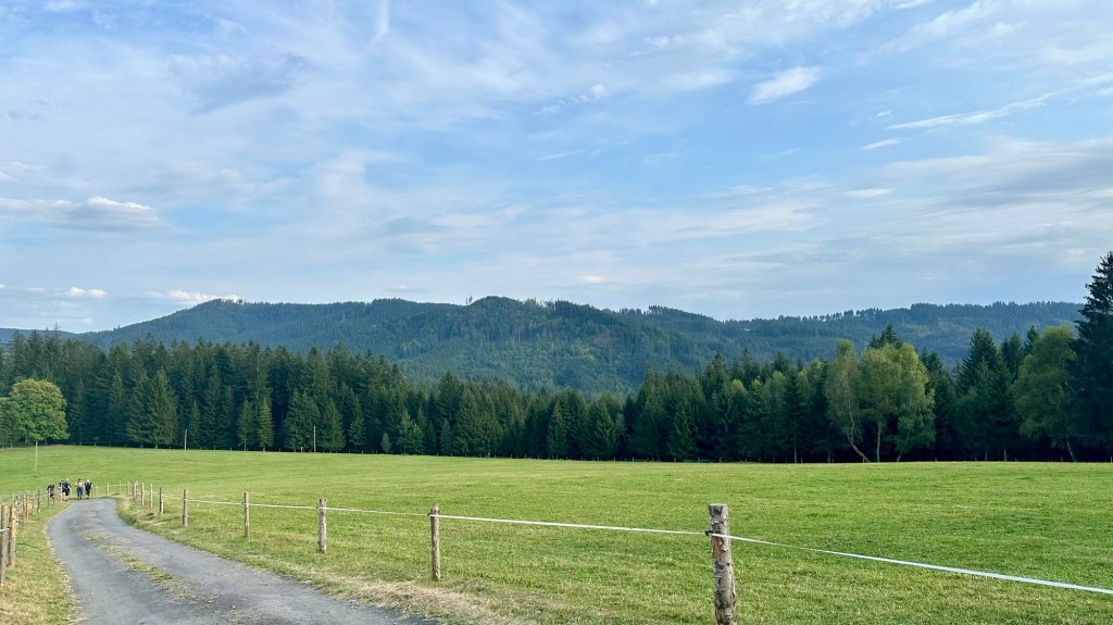 Jdu tedy dál. Ty místní louky, pastviny jsou krásné. Konečně mám pocit, že jsem na horách. Doteď se mi zdálo, že jen chodím nahoru a dolu. Někde v lese přede mnou slyším štěkat psa a někoho křičet „držte si ho“ a ješte něco. Chvíli raději stojím a čekám, co bude. Na psychickem klidu mi to moc nepřidá.