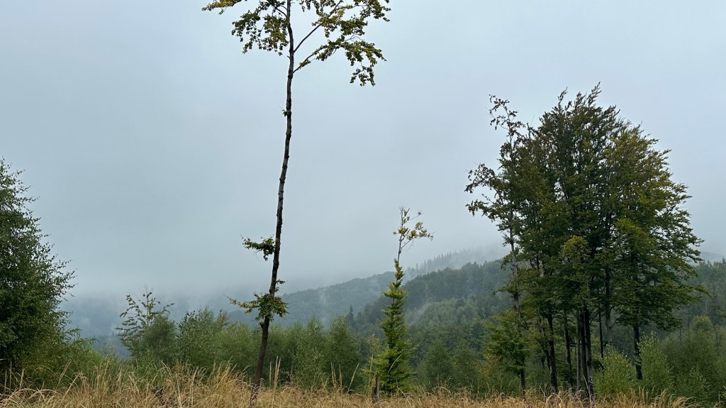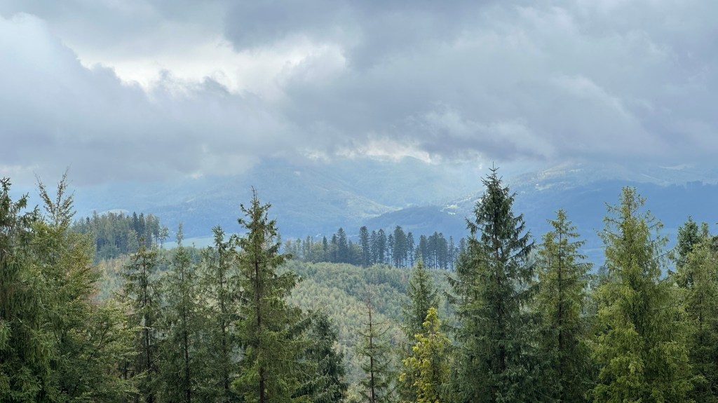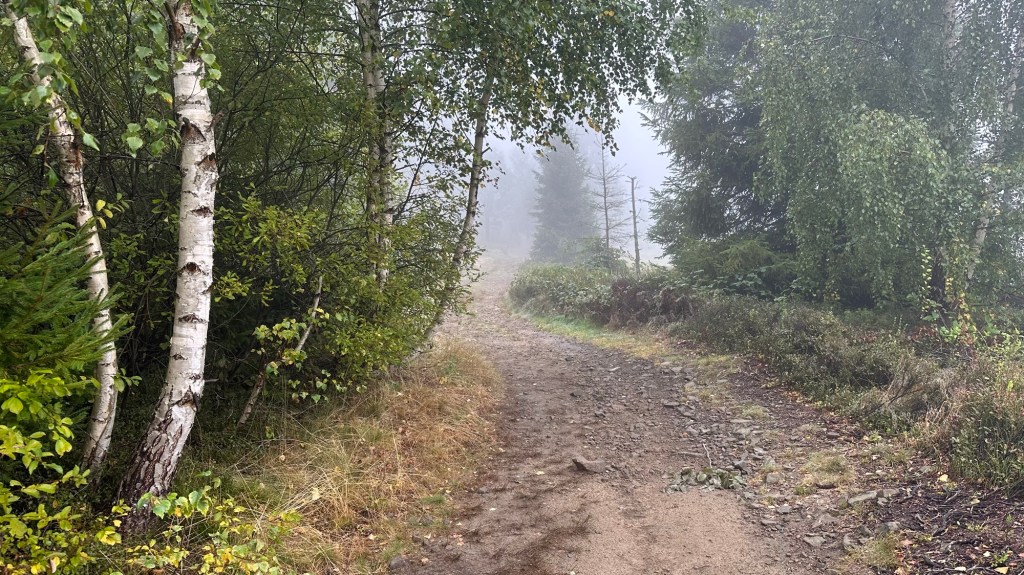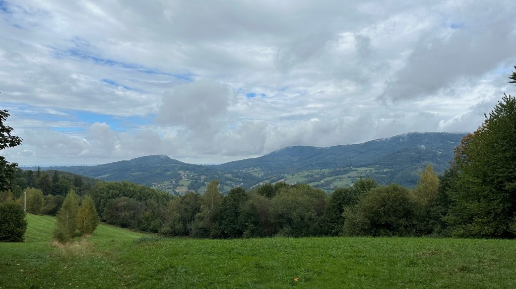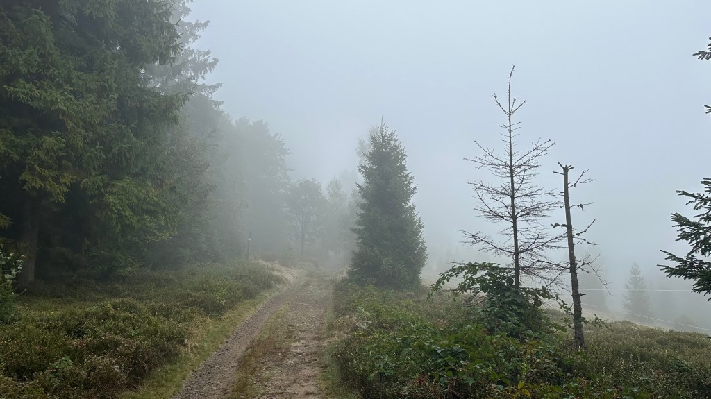 Z pokoje mám krásný výhled do údolí polských Beskyd. Ráno se kochám pohledem na ležící mlhu do které vyrážím lehce před desátou.